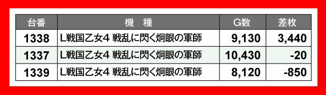 『L戦国乙女4 戦乱に閃く炯眼の軍師』は全台が高稼働。1万G達成台もあらわれ、プレイヤーも夢中で打ちこんでいたようだ。