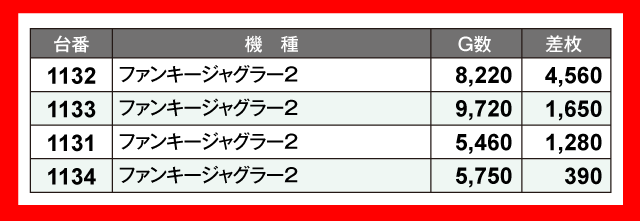 『ファンキージャグラー2』も十分なG数が回されていて、全台がプラス差枚と安定感を発揮している。