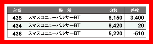 『スマスロニューパルサーBT』は総じて高稼働で、435番台はボーナストリガー機のポテンシャルをアピールしていた。