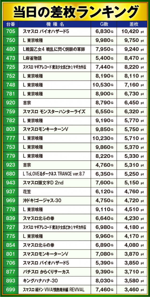 レポートの最後に「Super D’STATION高崎本店」の差枚ランキングも掲載!