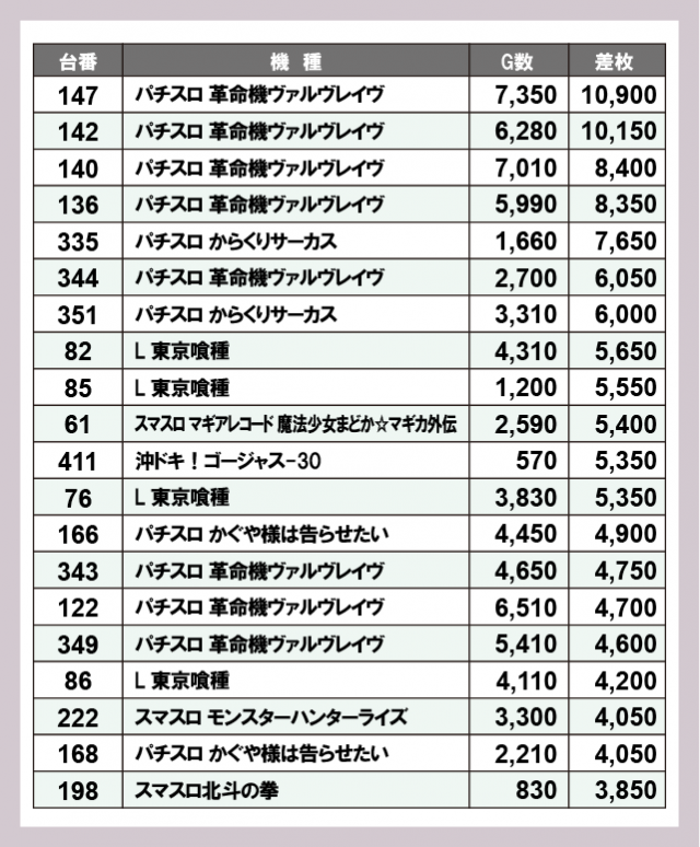 機種別差枚ランキング