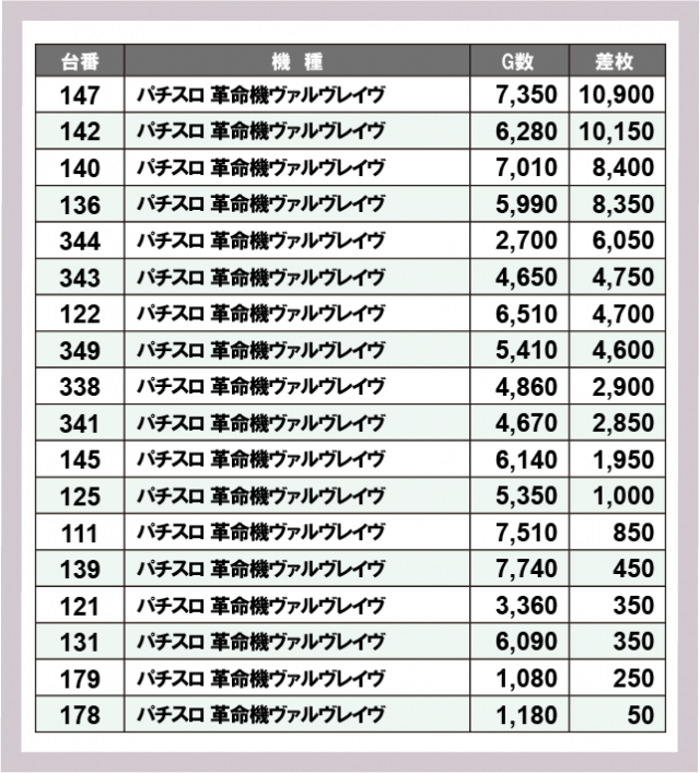 ※差枚数順に掲載しています