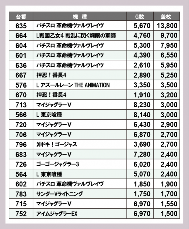 ※差枚数順に掲載しています