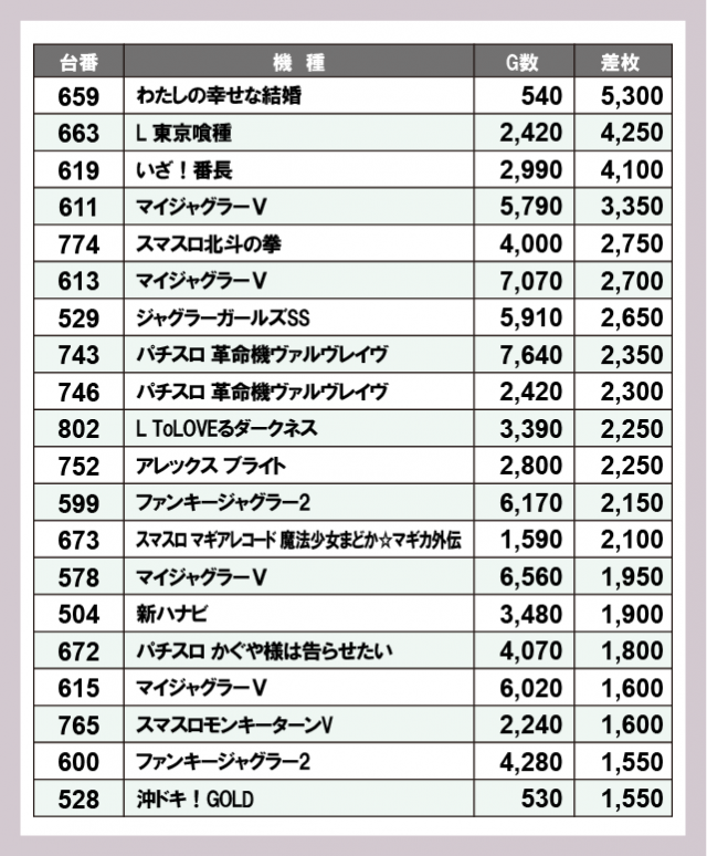 ※差枚数順に掲載しています
