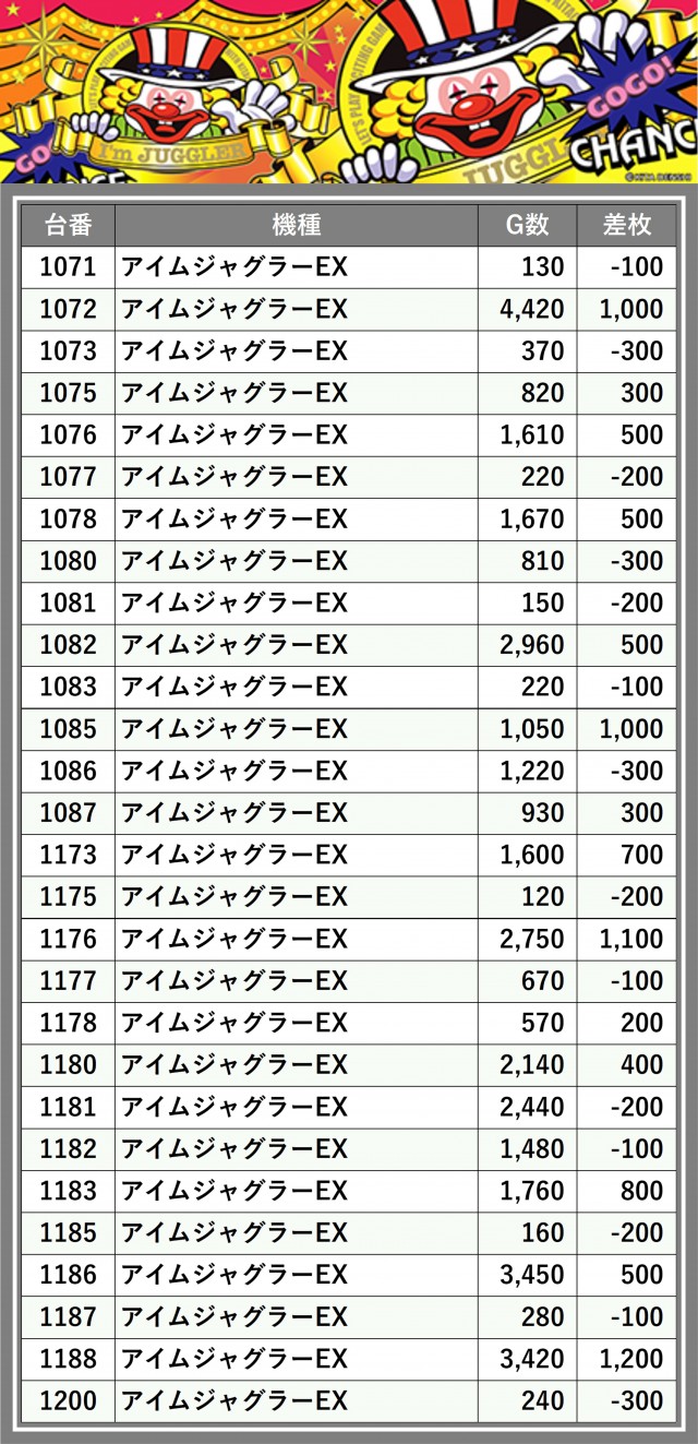 ※差枚数順に掲載しています