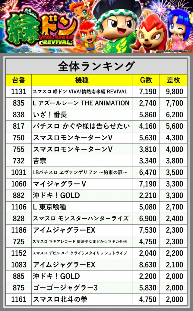 ※差枚数順に掲載しています