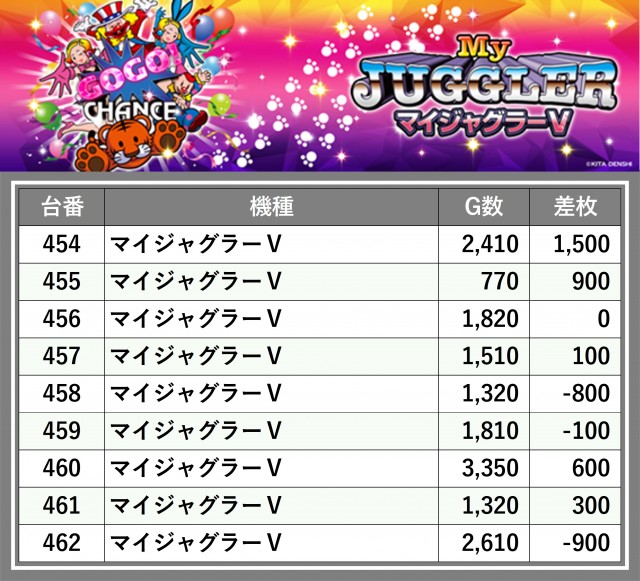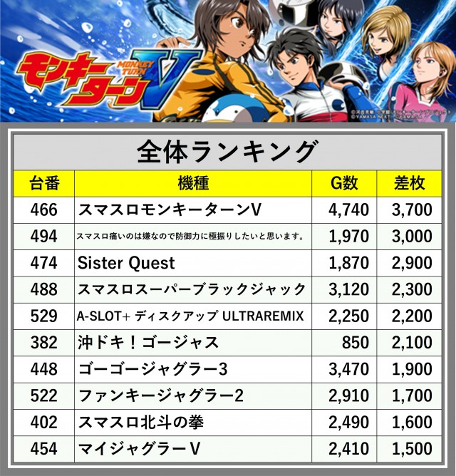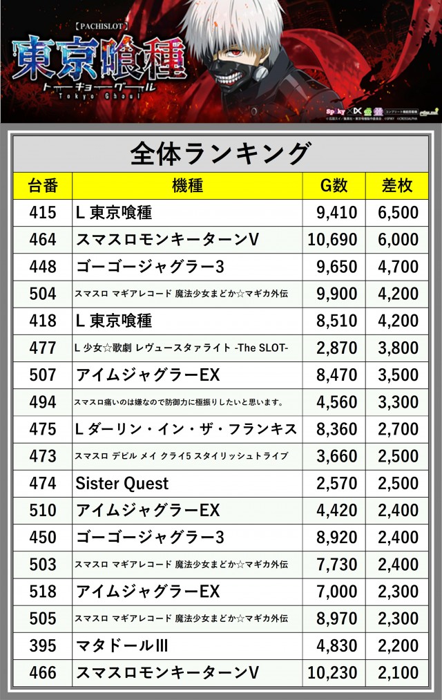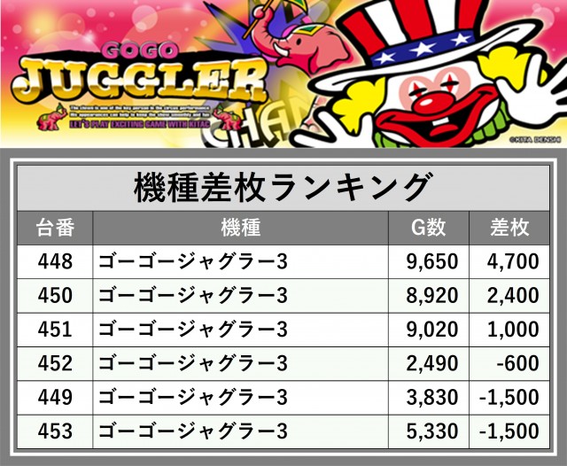 厳選された取材対象機種をはじめ、その他スロット全体から好記録が飛び出した!プレイヤーが楽しんだ1日を下記データにて振り返ってみて欲しい。