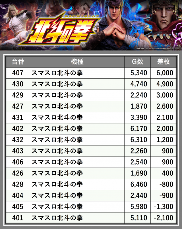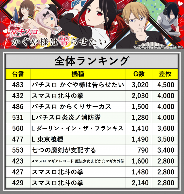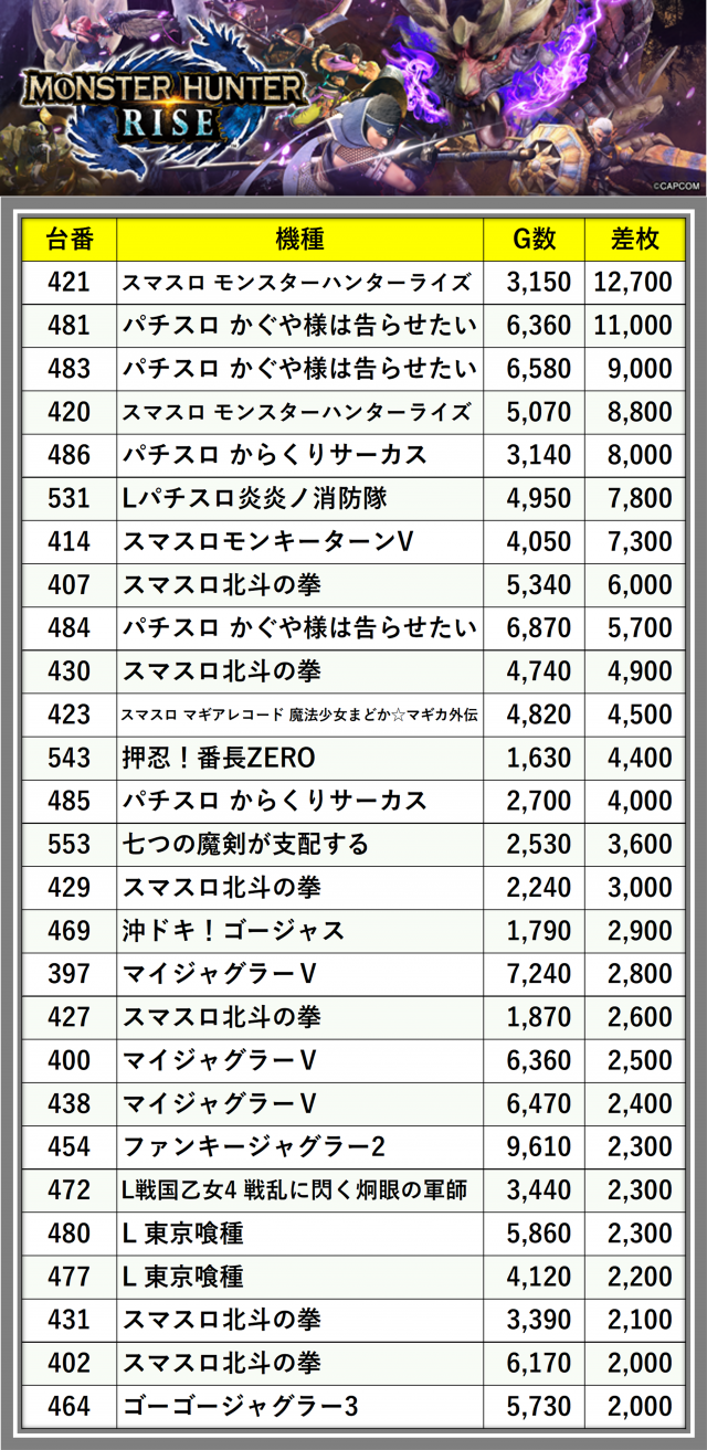 ※差枚数順に掲載しています