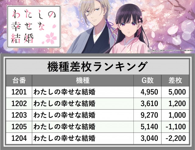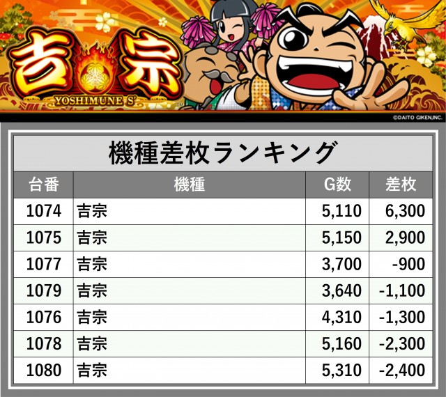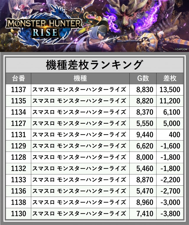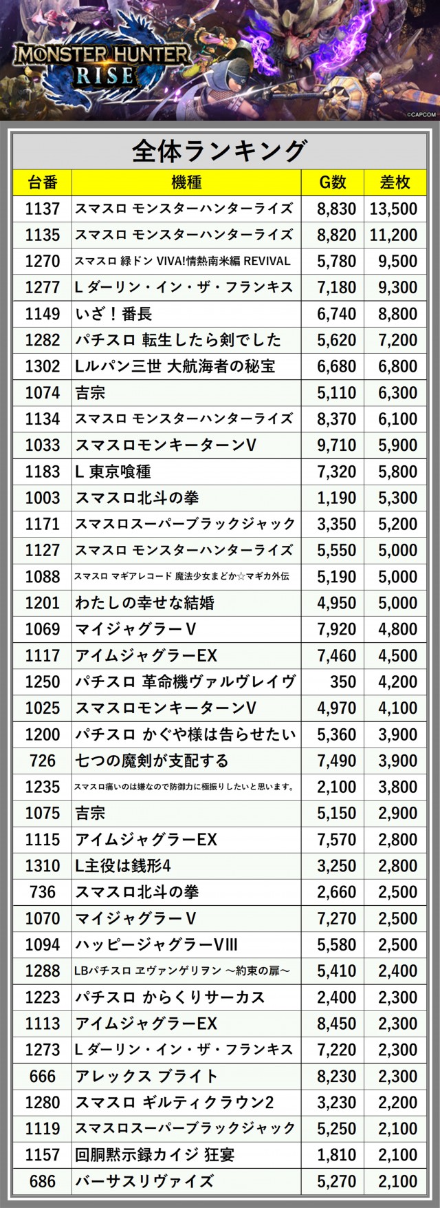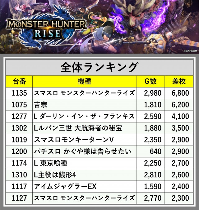 ※差枚数順に掲載しています