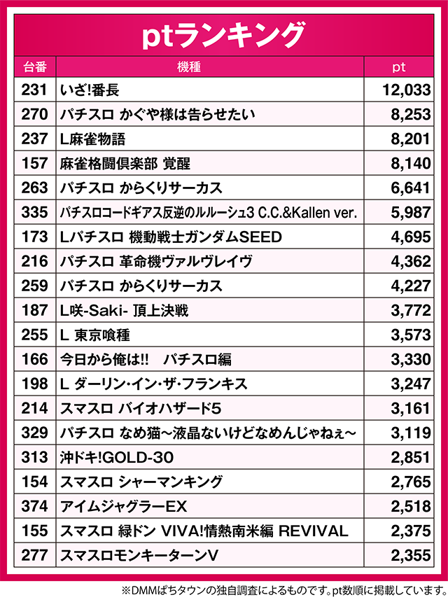 「パチスロ かぐや様は告らせたい」の270番台や「L麻雀物語」の237番台、「麻雀格闘倶楽部 覚醒」の157番台も8,100ptオーバー。