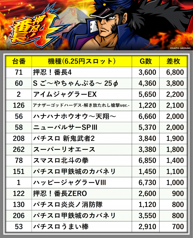 厳選された取材対象機種をはじめ、その他スロット全体から好記録が飛び出した!プレイヤーが楽しんだ1日を下記データにて振り返ってみて欲しい。
