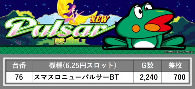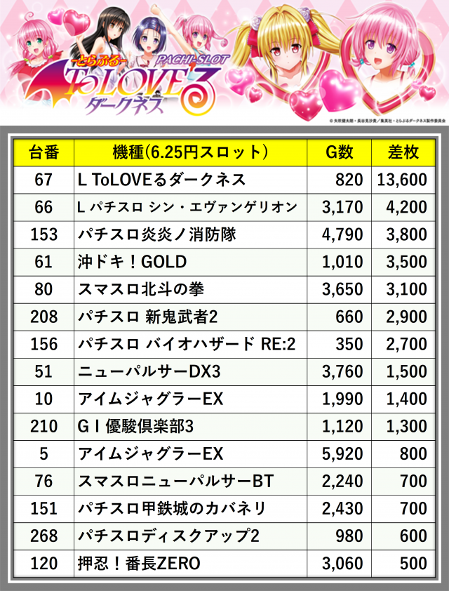 厳選された取材対象機種をはじめ、その他スロット全体から好記録が飛び出した!プレイヤーが楽しんだ1日を下記データにて振り返ってみて欲しい。