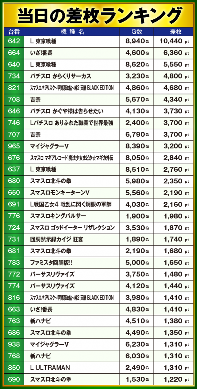 ※差枚数順に掲載しています