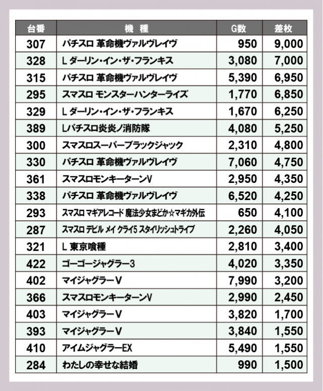 ※差枚数順に掲載しています