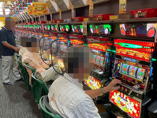500円/90枚パチスロの支持も厚く、様々な機種で楽しそうにレバーを叩くプレイヤーが見られた。