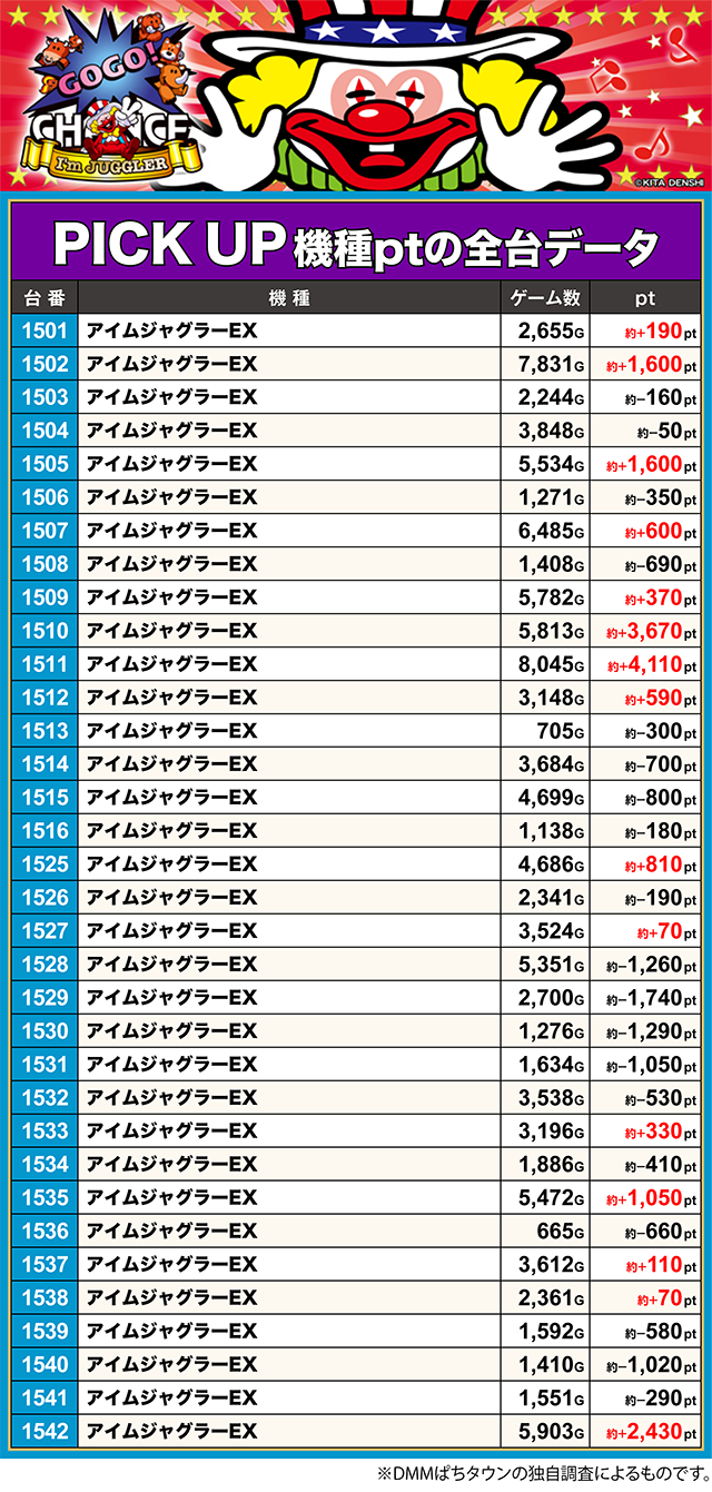 「アイムジャグラーEX」は15台がプラスとなり、6台が約+1,000ptオーバー。