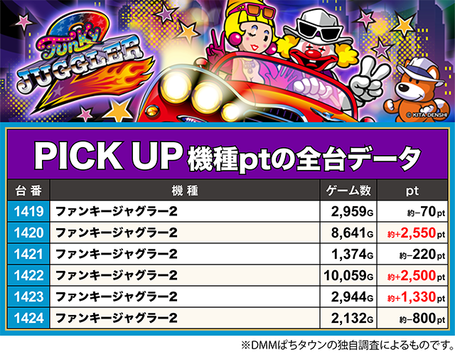 「ファンキージャグラー2」では、1420番台と1422番台が約+2,500pt以上。