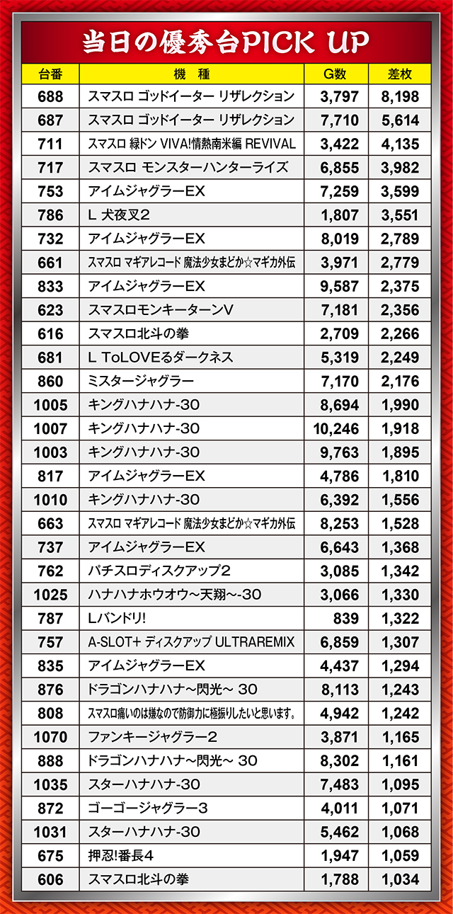 『スマスロ ゴッドイーター リザレクション』が1・2フィニッシュを決めた今回。隣同士の2台が1位・2位という奇跡的な結果が誕生した。注目はTOP10内に『アイムジャグラーEX』が3台もランクインを果たしたことだろう。