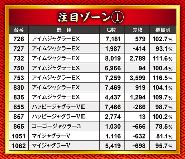 今回も好結果の多かった『アイムジャグラーEX』。この日のTOP10に食い込む台が複数あった一方で、良挙動を見せながらも最終的にマイナスで終わってしまった無念の台も…。その傾向は他の『ジャグ』にも見られたようだ。