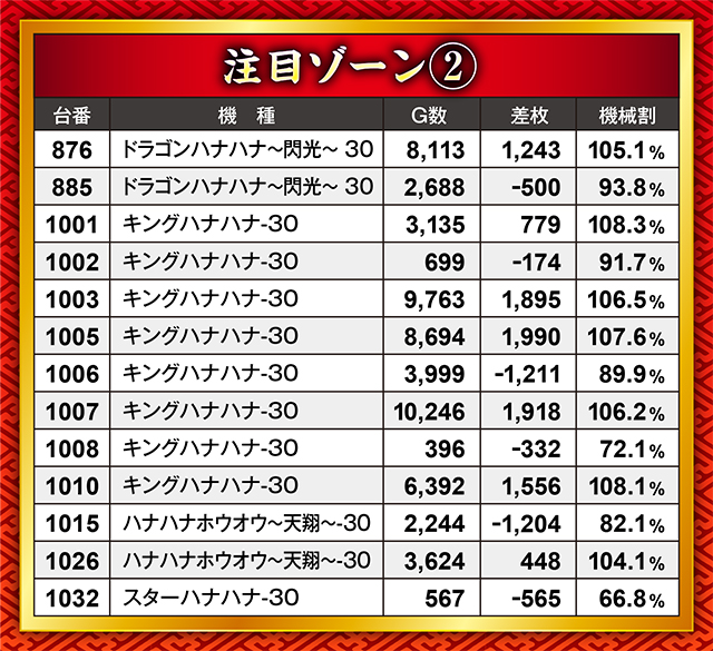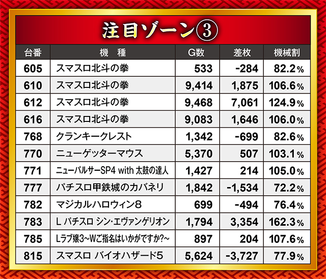 期待されていたものの、思うような結果にならずに閉店を迎えてしまった台がこちら。全体的に稼働が少なく、本領を発揮できぬまま終わってしまった印象。