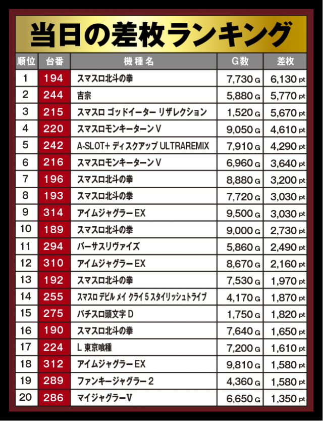この日のSAPグループはひと味違う。DMMぱちタウンは、「SAP流山」の特別なひとときを一斉取材した。特に華々しい活躍を残した機種たちをピックアップして紹介しよう。まずは差枚ランキングの発表だ!