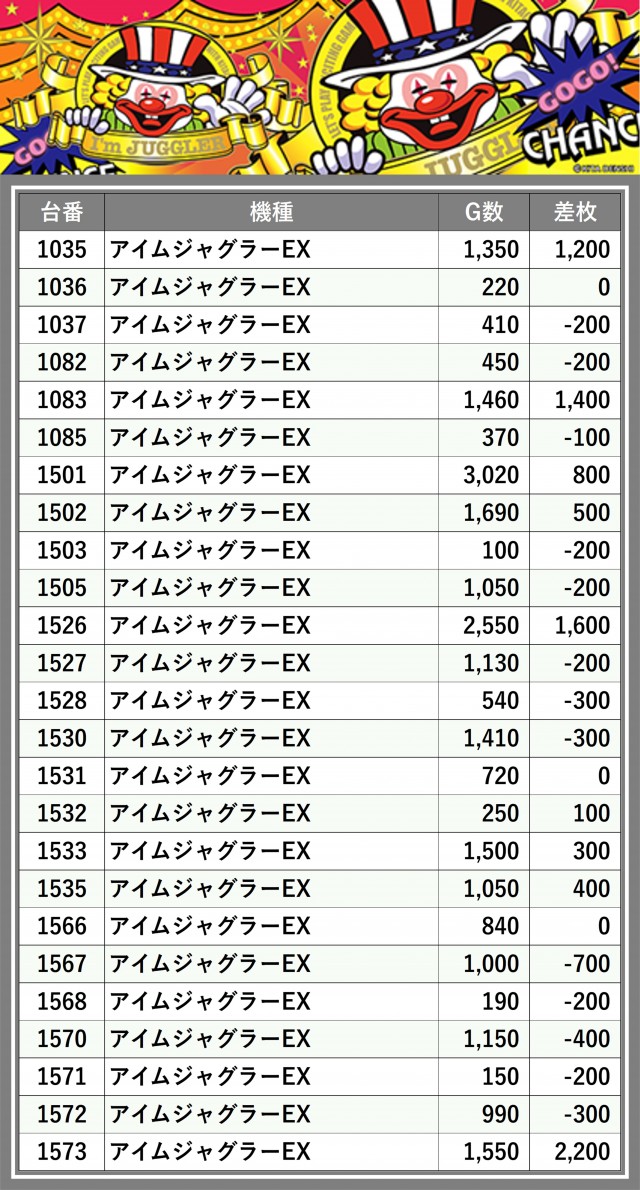 厳選された取材対象機種をはじめ、その他スロット全体から好記録が飛び出した!プレイヤーが楽しんだ1日を下記データにて振り返ってみて欲しい。