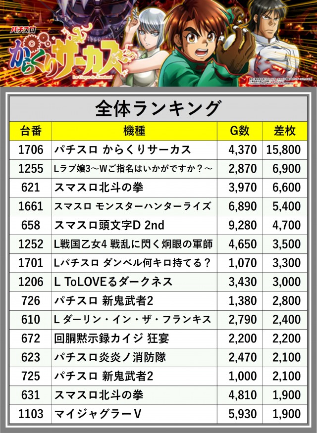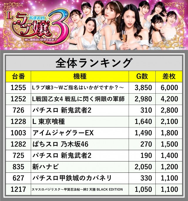 厳選された取材対象機種をはじめ、その他スロット全体から好記録が飛び出した!プレイヤーが楽しんだ1日を下記データにて振り返ってみて欲しい。