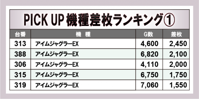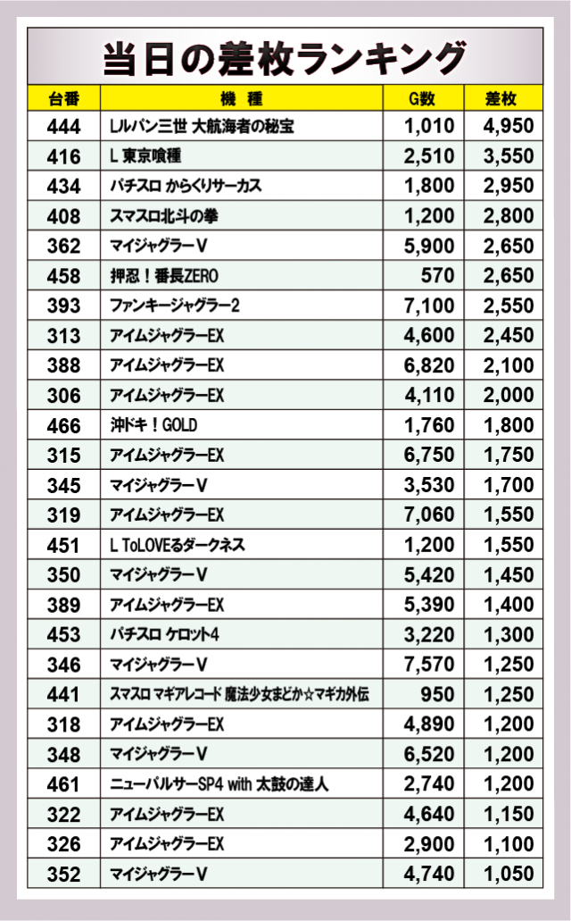 この日のトップを飾ったのは『Lルパン三世 大航海者の秘宝』で+4,950枚をマーク!また差枚ランキングの半数近くを『ジャグラー』シリーズが占めており、各所で右肩上がりのグラフを描く台が見受けられた。