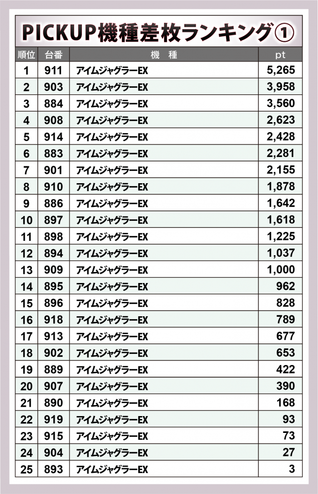 『マイジャグ』20台もちょうど半数がプラス。+3千弱×1・+1千超×4と、悪くない環境であったのが伝わってきた。