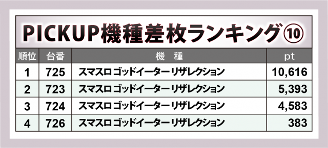 『スマスロ ゴッドイーター リザレクション』7台もプラス率5割オーバー。725番台が+1万6百超となった上に、+5千4百弱・+4千6百弱と続いた。