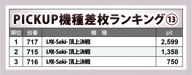 新台の『L咲-Saki- 頂上決戦』は設置3台全てが勝利を成し遂げた。しかし+2千6百弱・+1千4百弱が1台ずつと、もうひと伸びが欲しかった。