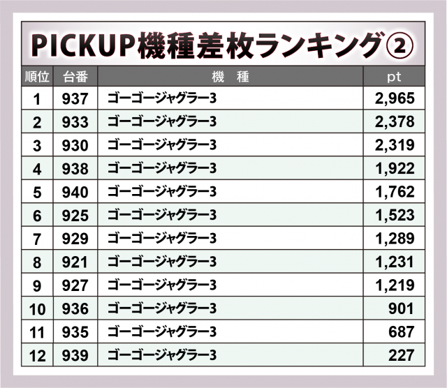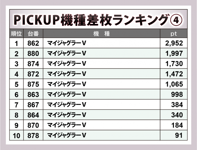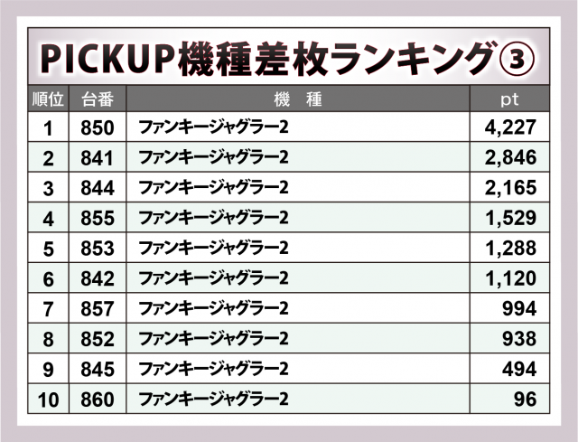 『ファンジャグ』20台はピッタリ半分の台が勝利。850番台の+4千2百超を筆頭に+2千1百超×2・+1千1百超×3と、上2機種に対抗した。
