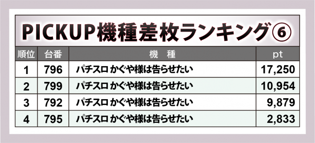 『パチスロ かぐや様は告らせたい』10台では勝率5割には及ばなかったものの、796番台が+1万7千3百弱&799番台が+1万1千弱と躍進。さらに+9千9百弱・+2千8百超と、4台が素晴らしい数値を弾き出した。