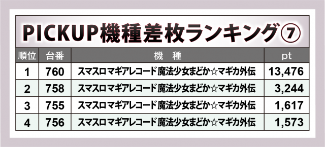 『スマスロ マギアレコード 魔法少女まどか☆マギカ外伝』6台では4台が勝利。しかも760番台が+1万3千5百弱、+3千2百超×1・+1千5百超×2と、クオリティは高かった。