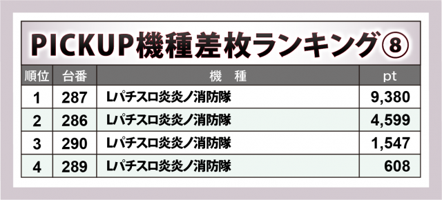 『Lパチスロ炎炎ノ消防隊』5台も優秀なプラス率。5桁には届かなかったものの、+9千4百弱・+4千6百弱・+1千5百超と、重い出玉が相次いだ。