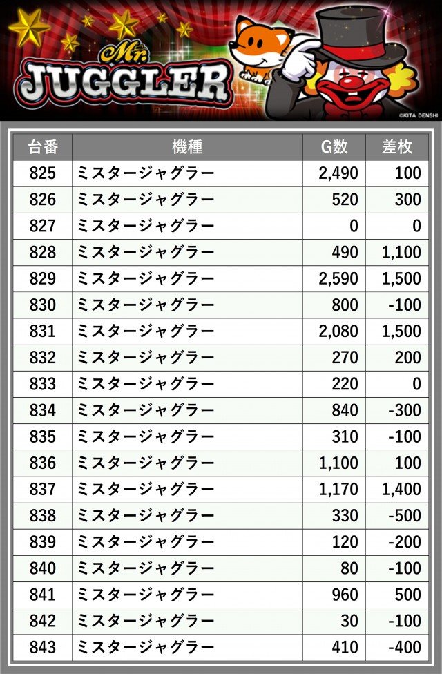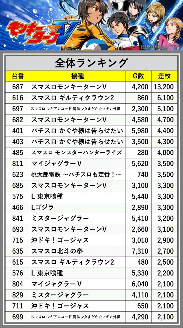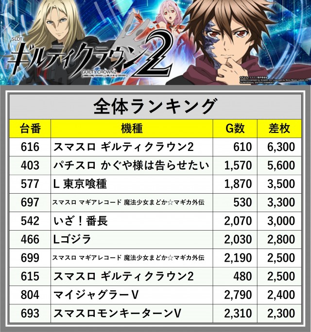 ※差枚数順に掲載しています