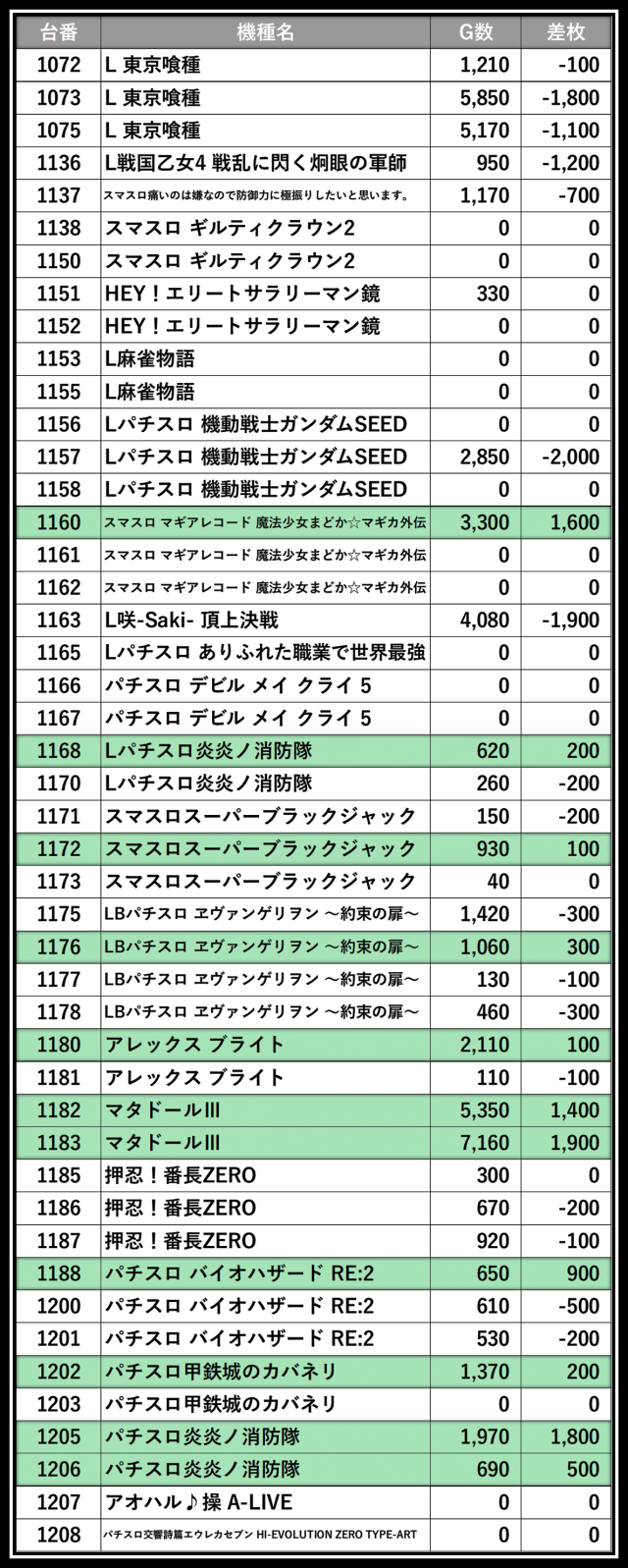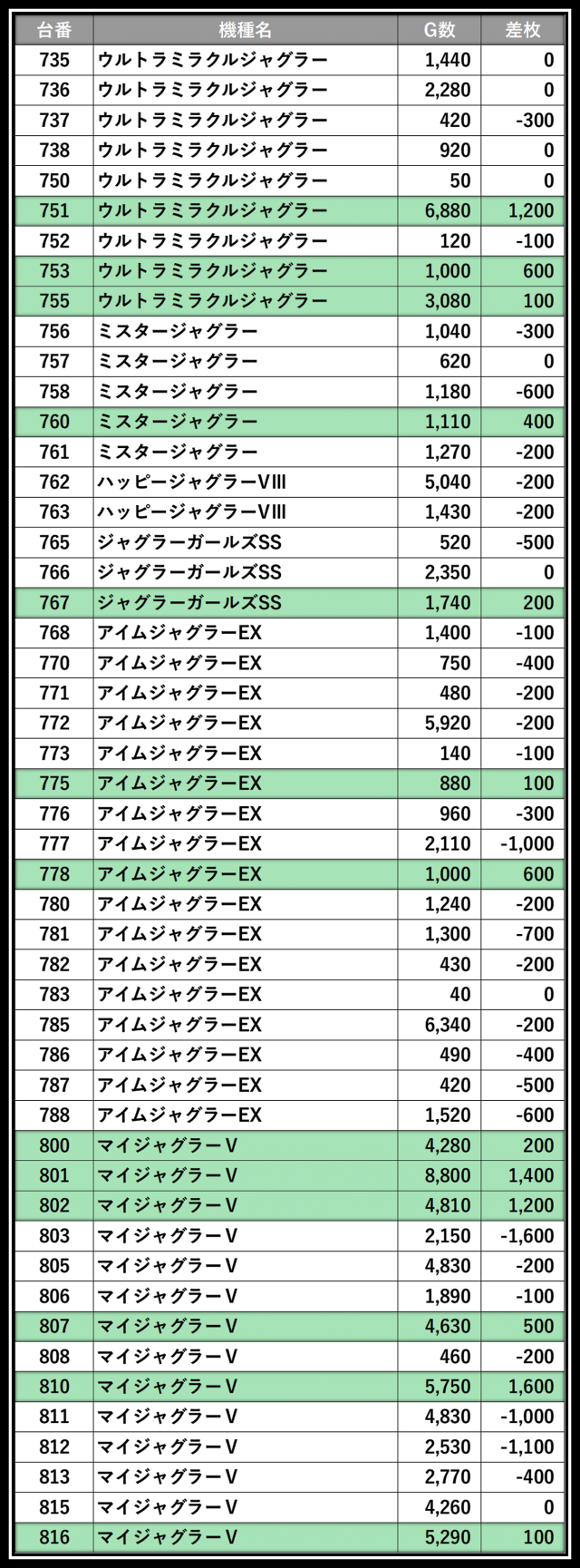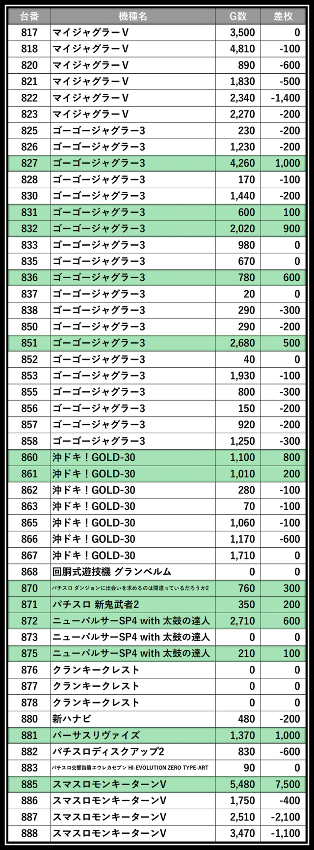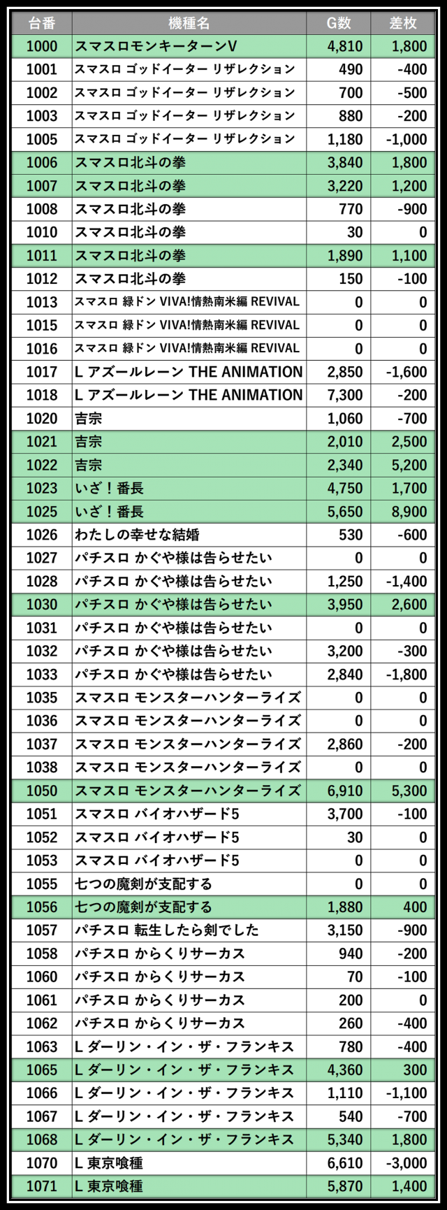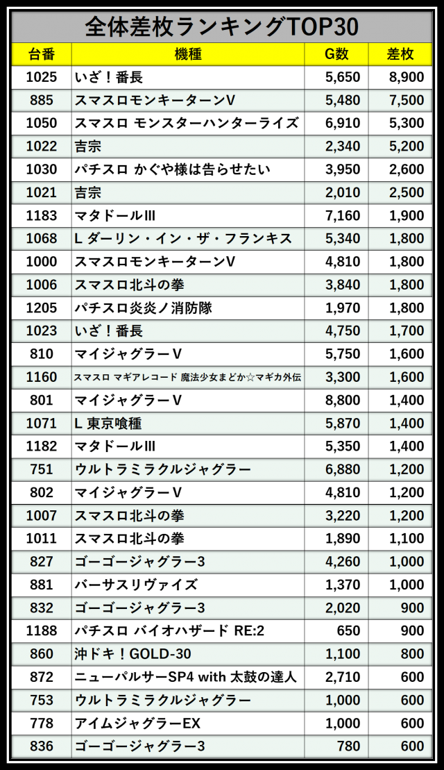 ※差枚数順に掲載しています