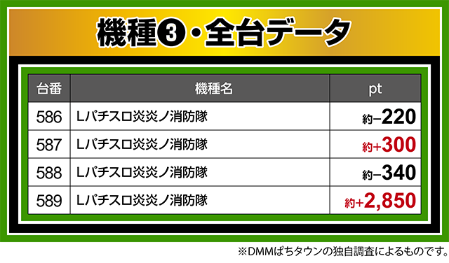 『Lパチスロ炎炎ノ消防隊』も活気があり、589番台が約+2,850ptを記録。