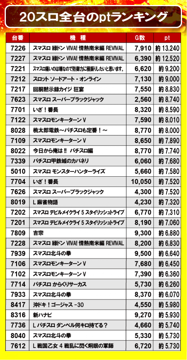 TOP1とTOP2はどちらも『スマスロ 緑ドン VIVA!情熱南米編 REVIVAL』から約13,240ptと約12,520ptで万ptOVERが2台も発生する驚異的な結果に!そして、よく見ると『スマスロ 緑ドン VIVA!情熱南米編 REVIVAL』から約6,830ptがもう1台!台番が続いていることからおそらく塊で投入していた可能性あり!また、ランキングに掲載されている全ての台が5,000ptOVERとなっており、全体を見ても非常に満足度の高い結果だ。