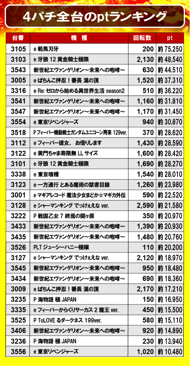 凄まじいスペックを持つ『e範馬刃牙』が約75,250ptでダントツのTOP1!それに続くような形で『e牙狼12黄金騎士極限』から約48,540pt!そして、『新世紀エヴァンゲリオン〜未来への咆哮〜』から約44,510pt!『新世紀エヴァンゲリオン〜未来への咆哮〜』は複数台がランキングに食い込んできており、特に状況が良かったように感じられる。