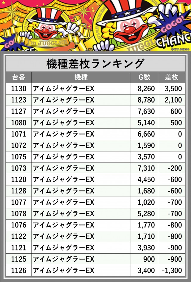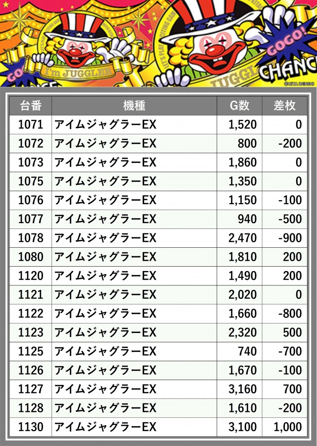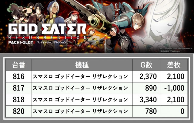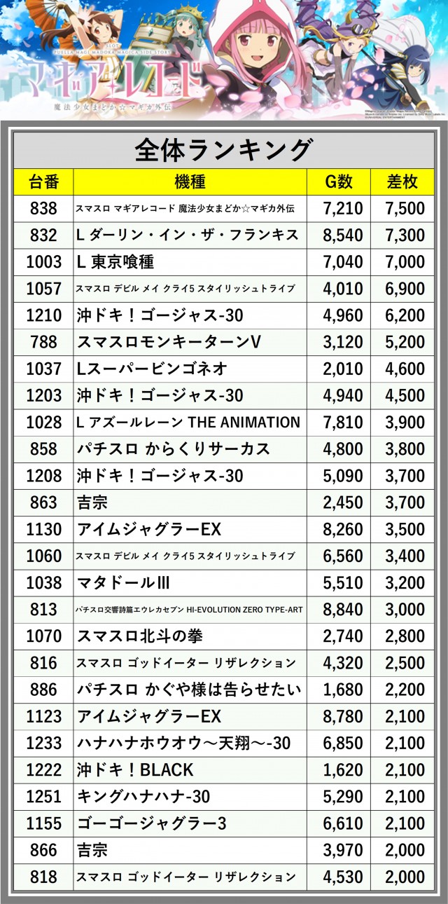 厳選された取材対象機種をはじめ、その他スロット全体から好記録が飛び出した!プレイヤーが楽しんだ1日を下記データにて振り返ってみて欲しい。