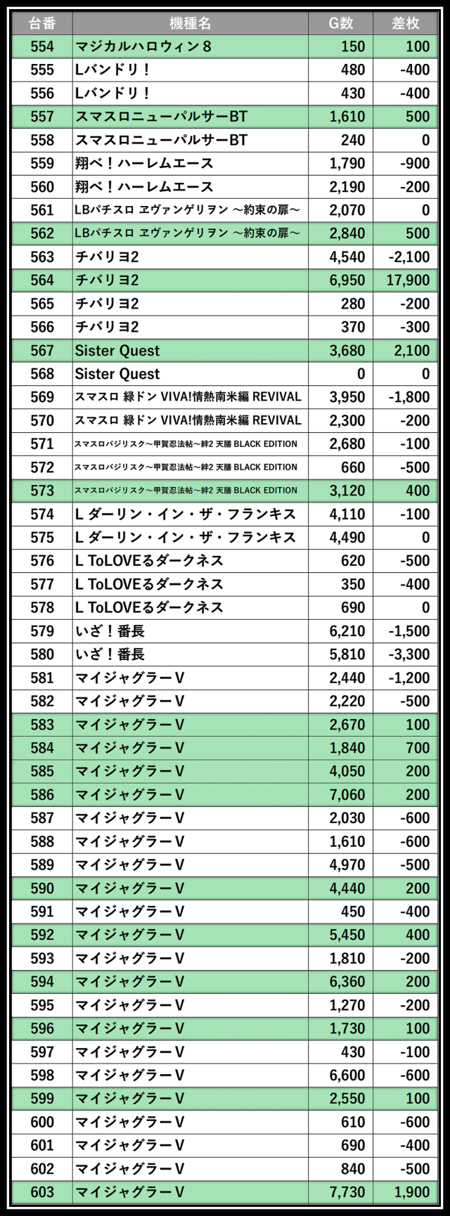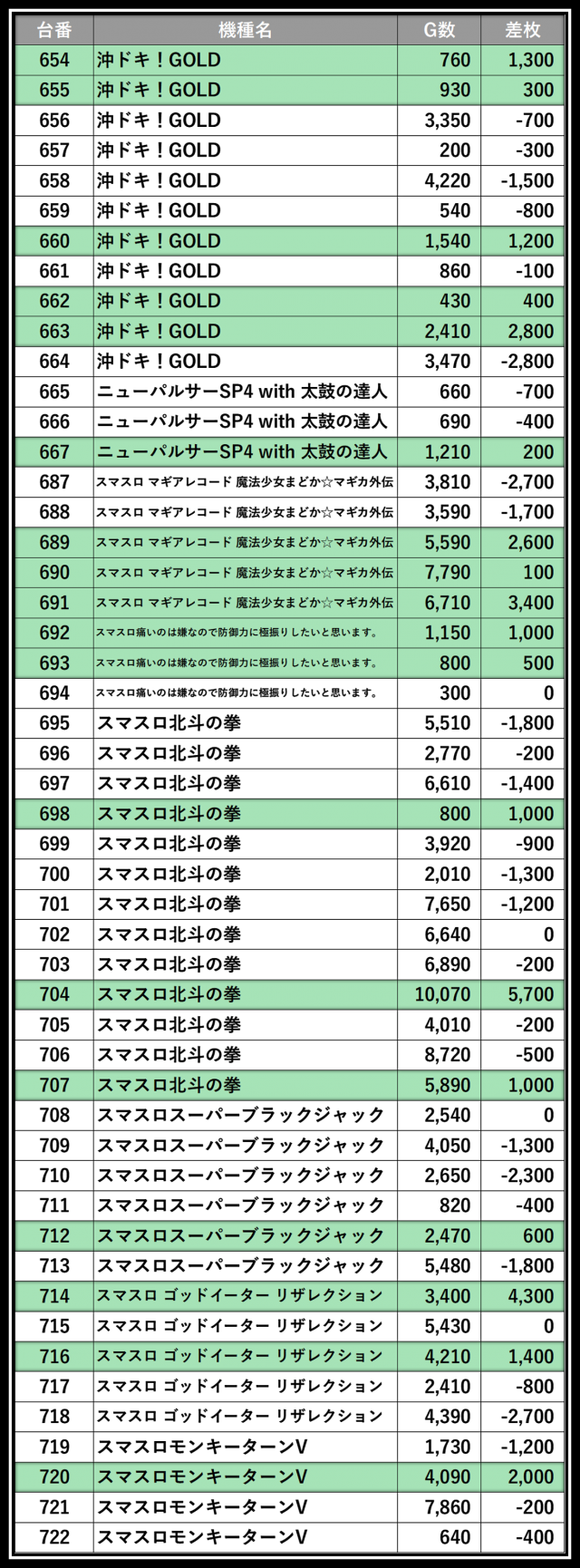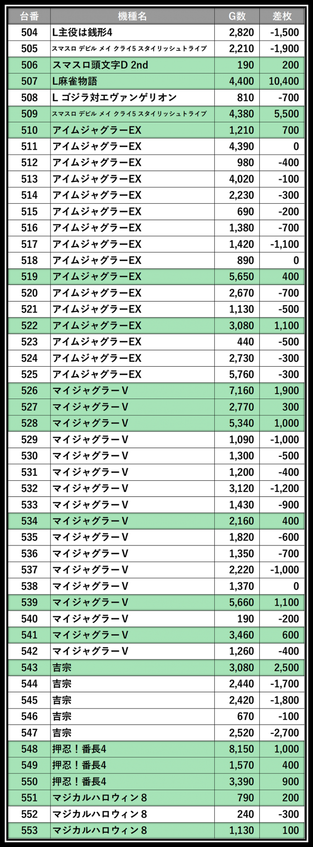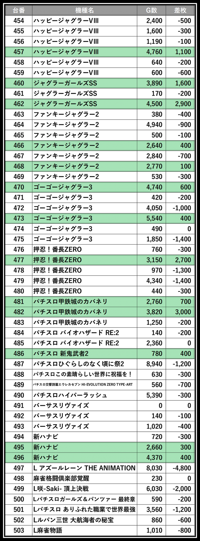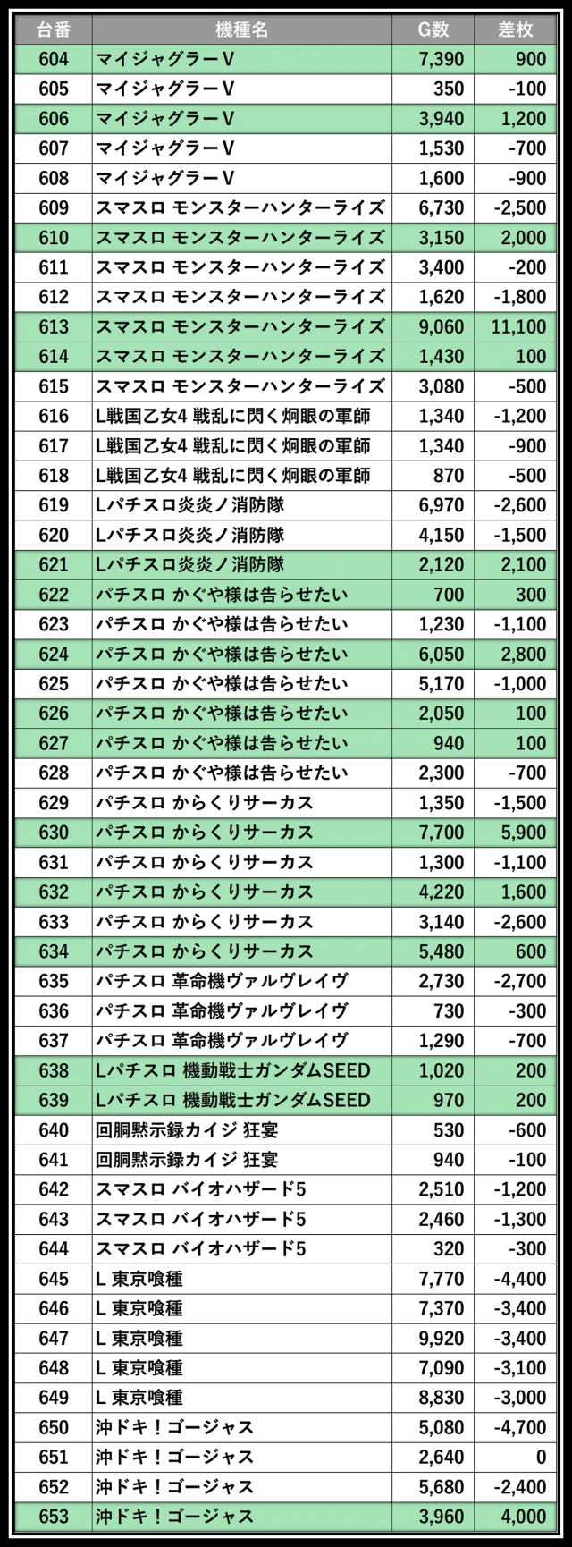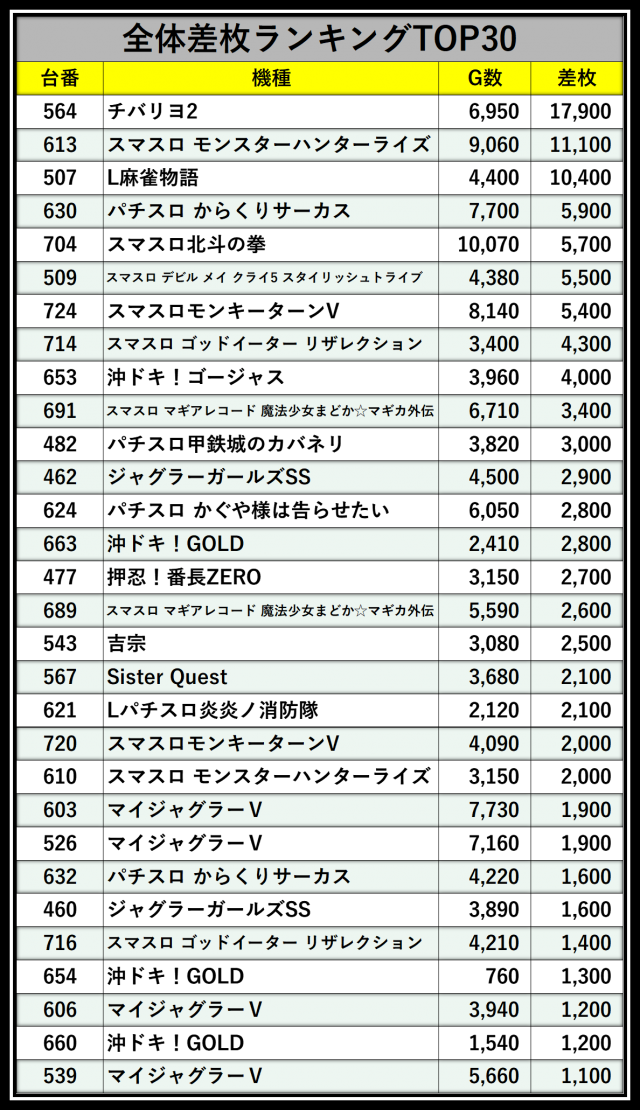 ※差枚数順に掲載しています