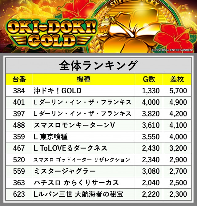厳選された取材対象機種をはじめ、その他スロット全体から好記録が飛び出した!プレイヤーが楽しんだ1日を下記データにて振り返ってみて欲しい。