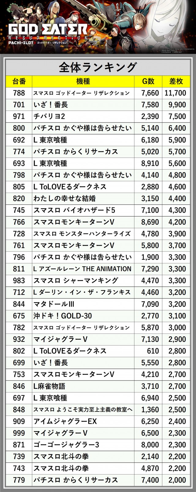 厳選された取材対象機種をはじめ、その他スロット全体から好記録が飛び出した!プレイヤーが楽しんだ1日を下記データにて振り返ってみて欲しい。