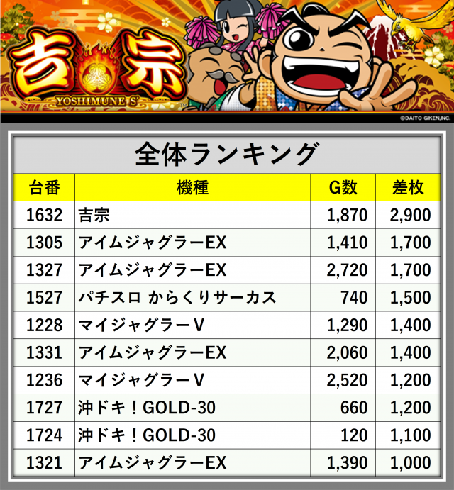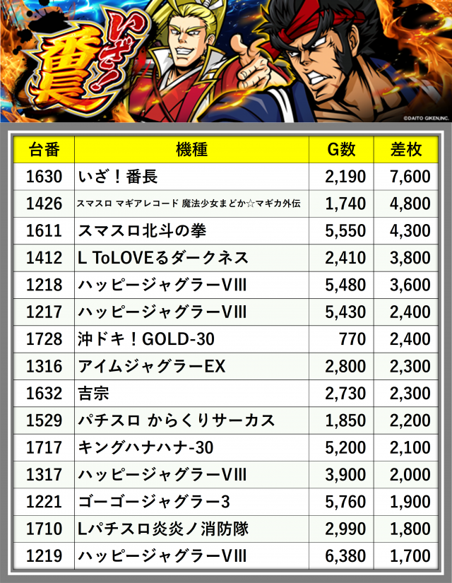 ※差枚数順に掲載しています