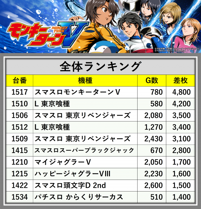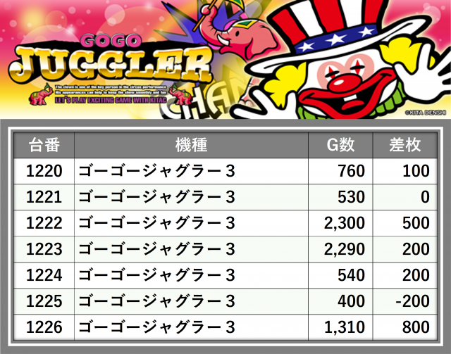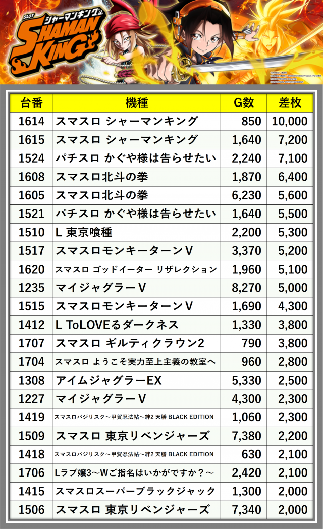 厳選された取材対象機種をはじめ、その他スロット全体から好記録が飛び出した!プレイヤーが楽しんだ1日を下記データにて振り返ってみて欲しい。