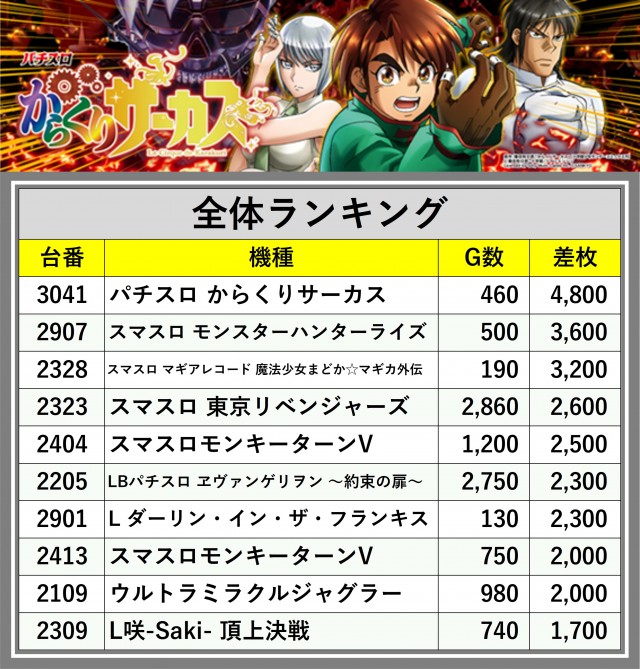厳選された取材対象機種をはじめ、その他スロット全体から好記録が飛び出した!プレイヤーが楽しんだ1日を下記データにて振り返ってみて欲しい。