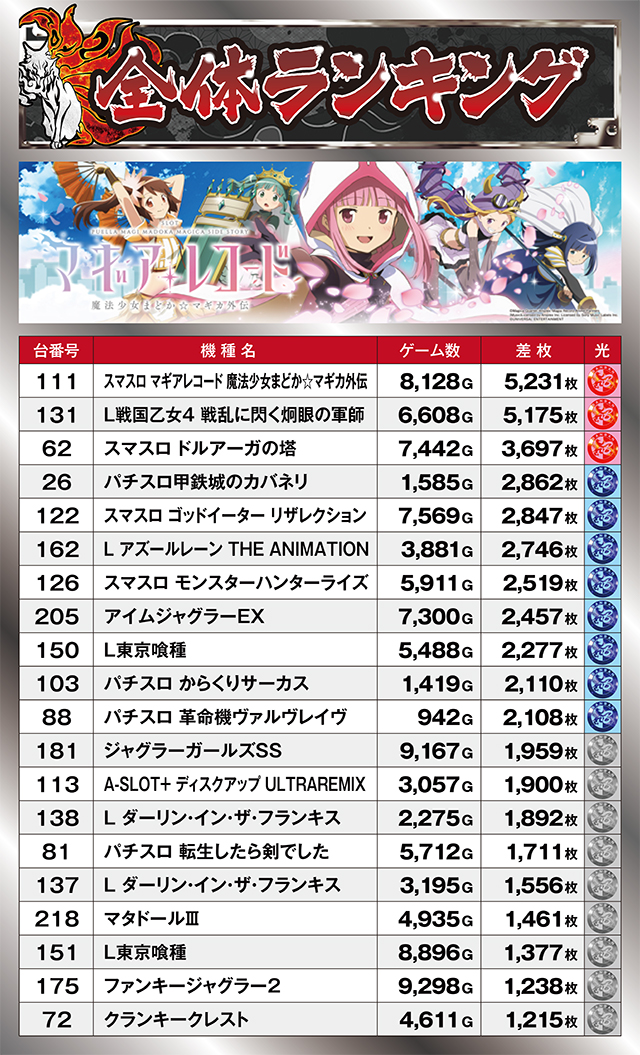 111番台の『スマスロ マギアレコード 魔法少女まどか☆マギカ外伝』と、131番台の『L戦国乙女4 戦乱に閃く炯眼の軍師』が揃って5,000枚超えを達成!