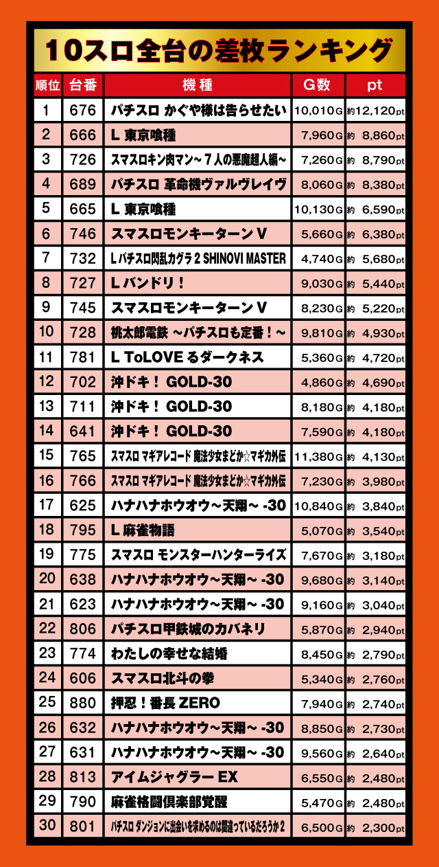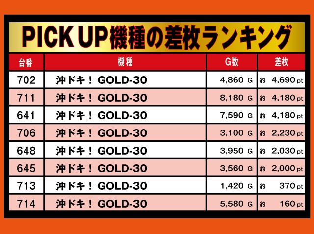 『沖ドキ!GOLD-30』からは+4,000pt超が3台も誕生しており、メイン機種としての人気ぶりを発揮していた。