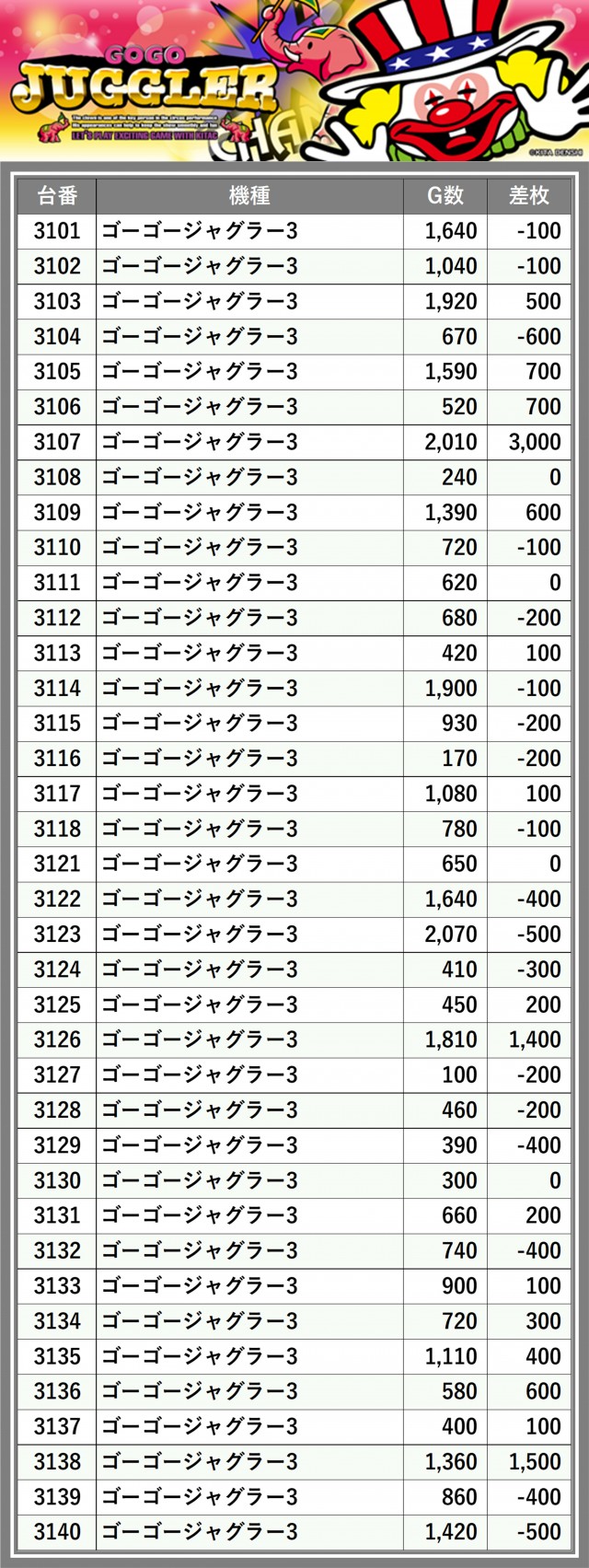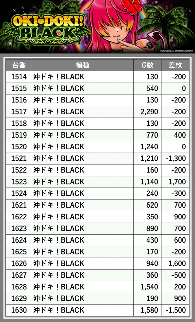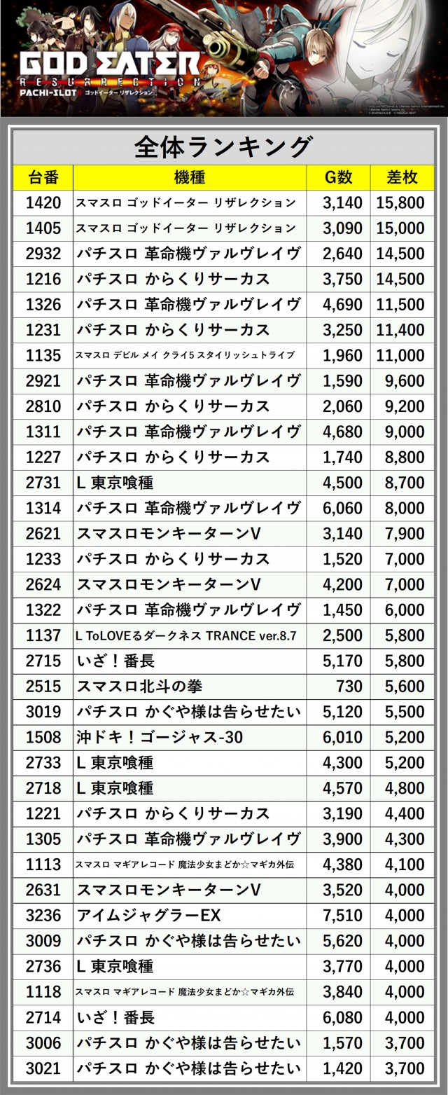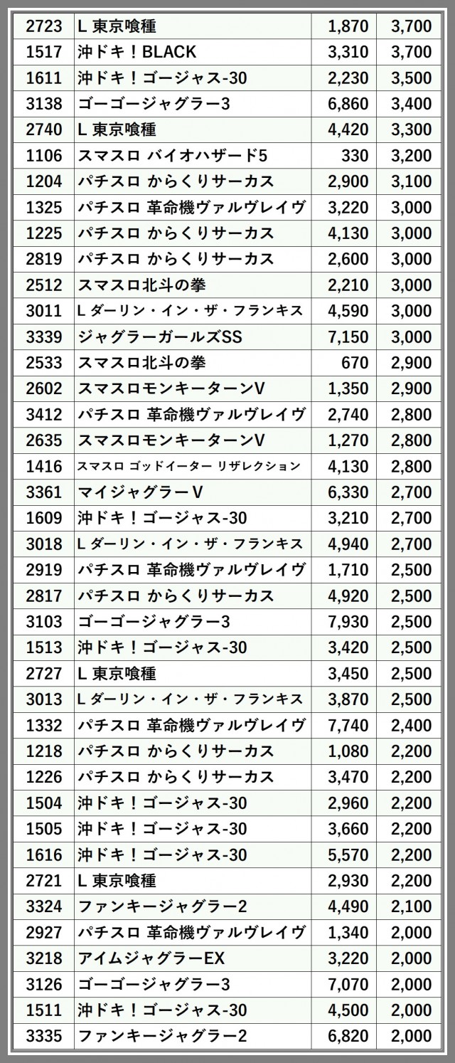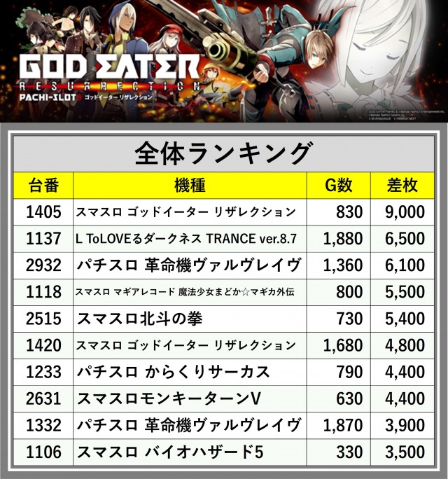 厳選された取材対象機種をはじめ、その他スロット全体から好記録が飛び出した!プレイヤーが楽しんだ1日を下記データにて振り返ってみて欲しい。